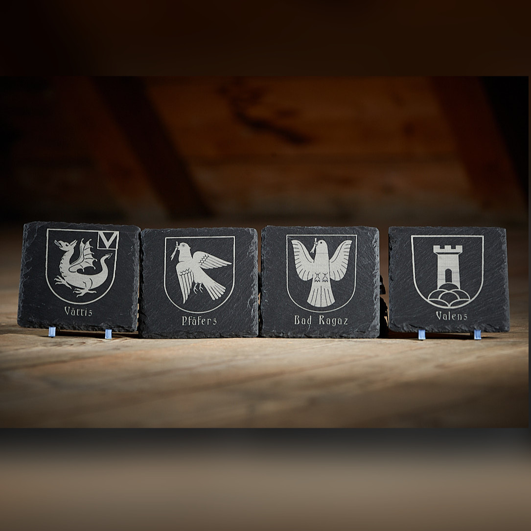 | Lieferumfang | Set von 4 Untersetzer mit Wappen der Gemeinden Bad Ragaz, Pfäfers, Vättis und Valens. |